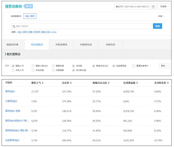 核心词确定下来的作用是什么呢?答案是:选择长尾词。关于长尾词的选择方法,我们在前面提到过很多次了。用生意参谋——市场行情(标准版以上)——搜索词查询功能,比如“T恤女 圆领”: